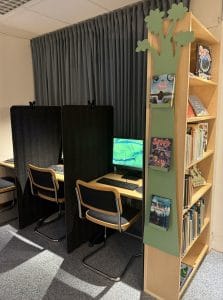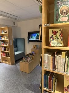 Skolbiblioteket är tänkt som en trivsam plats för både läslust och lugna stunder, där böckerna står i centrum.