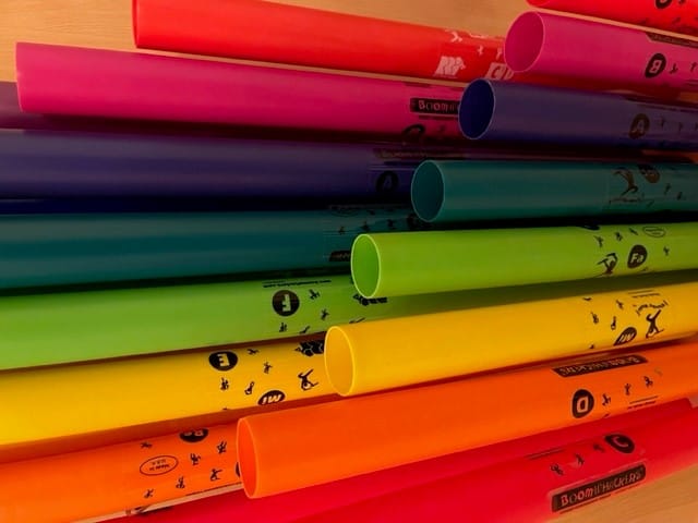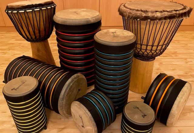 Förutom rytminstrument får barnen spela på xylofon och klangspel, tonboxar, boomwhackers, entonsflöjter, djembetrummor och bygelgitarr.